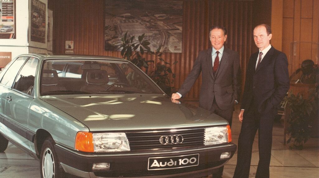 Audi 100 Premiere in Ingolstadt mit Vorstandsvorsitzendem Wolfgang Habbel und Vorstand Technische Entwicklung Ferdinand Piech 1982 © Audi