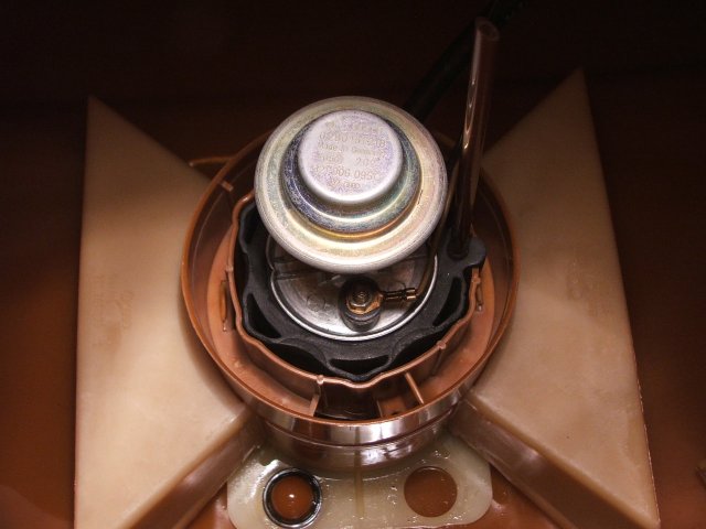 - Sicherungsring vom Kraftstoffstaubehälteroberteil entfernen. Dazu die zwei Kreuzschlitzschrauben - die eine sieht man im Bild, die andere liegt gegenüber - herausdrehen, und den Ring mitsamt der Rücklaufleitung über die Vorlaufleitung und das Kabel der Pumpe ziehen, dann aus dem Tank entfernen. Nun sieht man die Pumpe selbst: