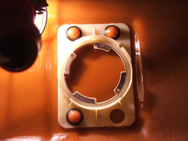 Der Bajonettverschluss am Tankboden. Oben im Bild ist vorne in Fahrtrichtung. Merke: die eine Öffnung (rechts oben) ist größer: