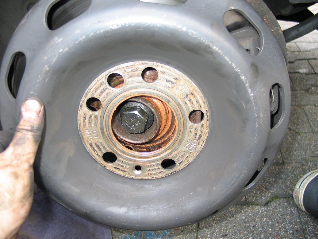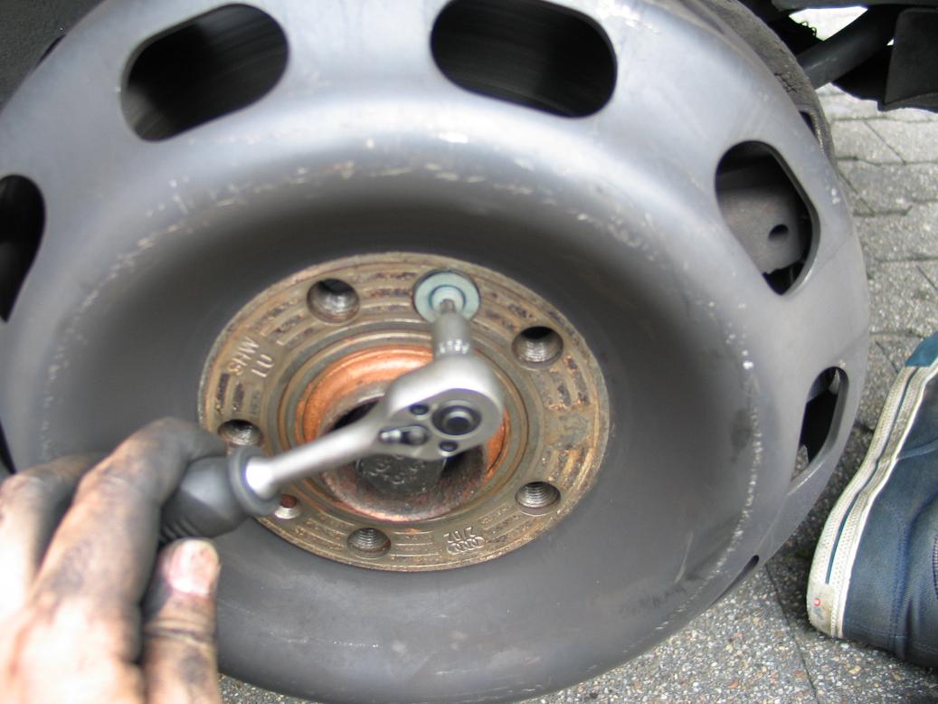 - Nachdem das Fahrzeug sicher aufgebockt ist, muss nun die Ufo Bremse weichen. Dazu zuerst die kleine Torx Schraube lösen, die die Scheibe auf der Nabe fixiert. (Beim 20V, V8 und einigen C4 befindet sich die gezeigte 'UFO'-Bremsscheibe. Beim Rest der Typ44 und C4 (100er, A6) Modelle befindet sich an der Stelle eine normale Bremsscheibe. Der Rest des Artikels (mit Ausnahme einiger Bilder der Bremsscheibe) gilt jedoch für beide Varianten!)