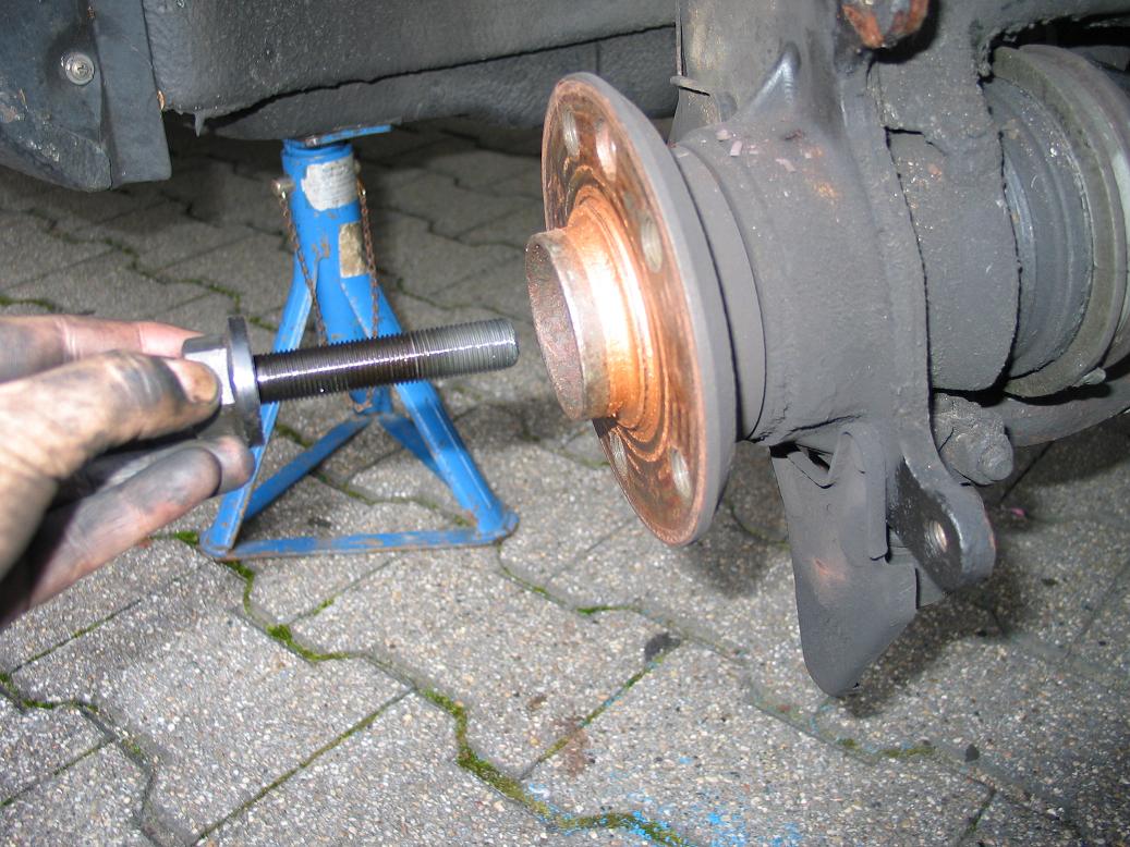 - Als erstes löst ihr die Radmuttern und die Zentralschraube der vorderen Antriebswellen. Hierzu habe ich eine stabile 27er Nuss und einen Knebel verwendet. Auf diesen habe ich ein langes Rohr gesteckt und so die notwendige Kraft zum Lösen der Schraube aufgebracht.