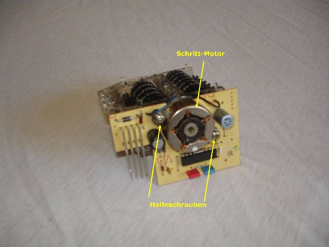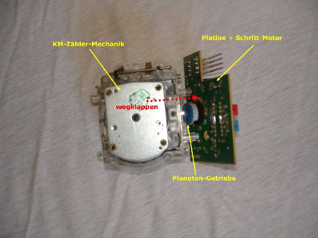 - VORSICHTIG (!!!) die Platine (samt Schritt-Motor) von der KM-Zähler-Mechanik seitlich abklappen *(BILD_013)*