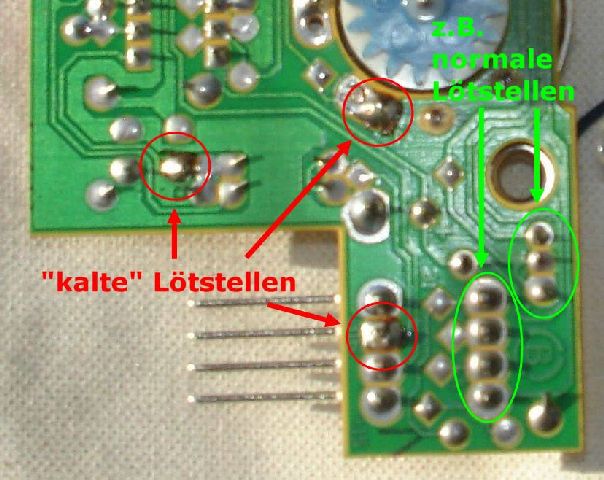 Die (auf den Bildern) markierten "kalten" Lötstellen waren in diesem Fall die Fehler-Quellen für die Fehlfunktion des KM-Zählers.