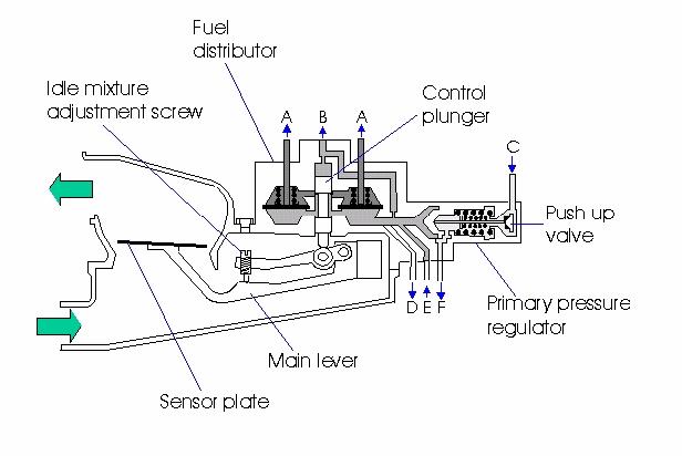 The Fuel Distribution Unit This unit delivers the correct amount of fuel to the engine via the injectors referencing to the airflow sensor plate height. As the sensor plate is lifted with inducted air volume, the control plunger is lifted proportionately, exposing small slits within the fuel distributor's barrel assembly. The barrel assembly has a series (one for each cylinder) of small slits that are machined into the barrel, and it is through these openings that the fuel passes en-route to the injector.