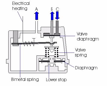 As the bi-metalic strip is heated, by either it's heater element or natural heat soak from the engine, the downward pressure acting on the spring is gradually decreased, increasing the force of the spring, which in turn increases the control pressure.