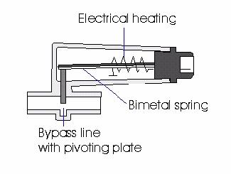 The internals of the warm-up-regulator are quite simple comprising an inlet and outlet port, a stainless steel shim, a bi-metalic heated strip and a spring.