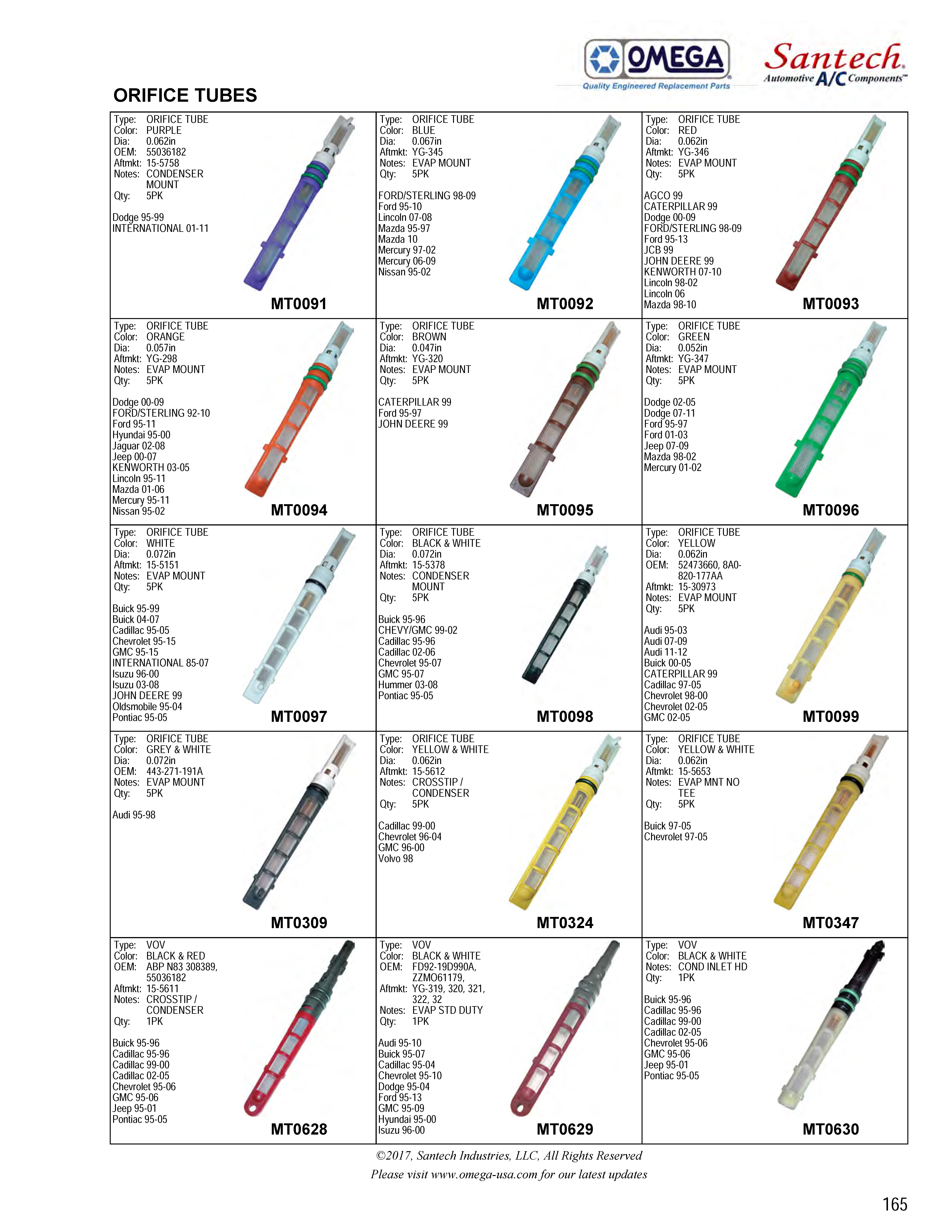 Außerdem wurde ein Santech/Omega-Katalogauszug gezeigt, der verschiedene Orifice Tubes nach Farbe und Spezifikation unterscheidet.