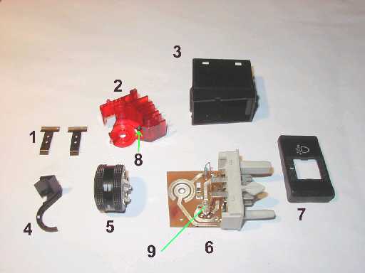 Roten Kunststofflichtleiter (2) mit Schraubendreher an den 4 Nasen heraushebeln. ACHTUNG! Jetzt fällt die Einrastkugel (8) heraus, diese ist sehr klein, nicht verlieren! Poti (5) abziehen. Die Leiterbahnen der Platine (6) mit Kontaktspray (Kontakt 60) reinigen. Leuchte (9) auslöten. Die Leuchte (12 Volt) gibt es in jedem größeren Elektronikgeschäft. Hier ein Beispiel: