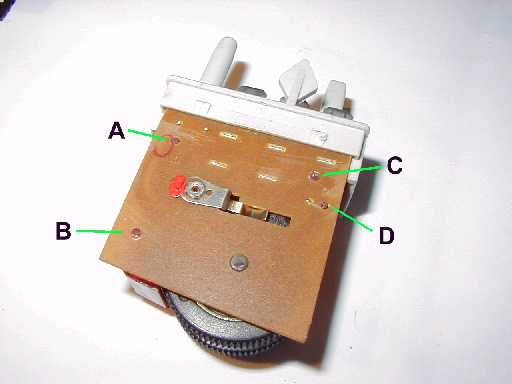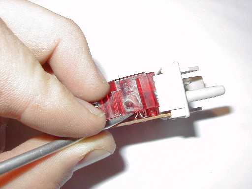 Der rote Kunststofflichtleiter (2) wird mit 4 Nasen (im Bild oben: A, B, C, D) an der Platine (6) festgehalten. Den überstehenden Teil der Nasen mit einer Schlüsselfeile vorsichtig abfeilen.