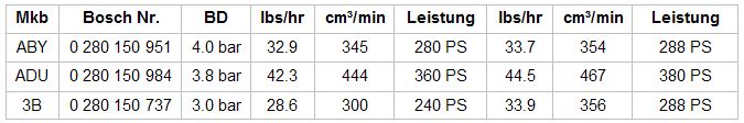 Die ABY Einspritzventile fördern bei 4.0 bar Benzindruck 32.9lbs/h (345cm³/min), bei 4,0bar wären das 33.7lbs/h (354cm³/min)