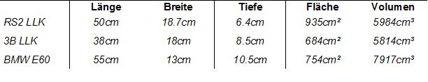 Vergleicht man den 3B und RS2 Ladeluftkühler miteinander dann wird man erkennen, dass der RS2 Ladeluftkühler eine um 250cm² größere Fläche hat. Der 3B LLK gleicht mit einem fast identischen Volumen (mehr Tiefe) wieder aus, allerdings ist der RS2 Kühler trotzdem besser, da die vom Fahrtwind gekühlte Fläche größer ist und auf Grund der Vollaluminium Bauweise dieser noch druckstabiler ist.