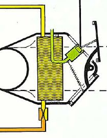 - An der unteren Klappe ist eine Feder eingehängt. Wenn der Umluftbetrieb ausgeschaltet wird, so bekommt die Unterdruckdose keinen Unterdruck mehr, und die Feder zieht die Umluftklappe zu. Entsprechend öffnet sich die Frischluftklappe zum Wasserkasten. Der Verdampferkasten saugt Außenluft an - es herrscht Frischluftbetrieb. Im folgenden Bild sieht man, wo das obere Ende der Feder normalerweise eingehängt ist. Das untere Ende wird in der Umluftklappe eingehängt.
