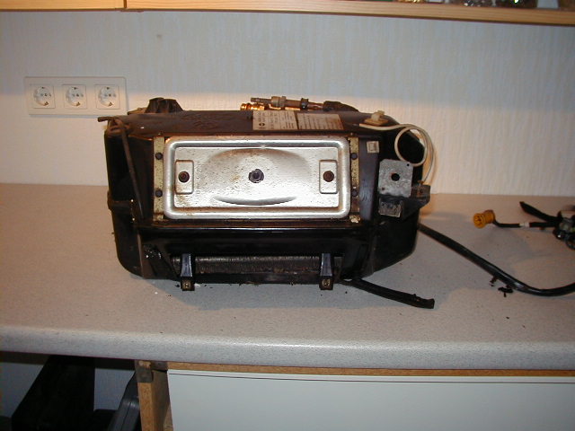 - Hier nun ein Bild eines ausgebauten Verdampferkastens (Blickrichtung aus dem Auto). Man sieht die Frischluftklappe. Die Umluftklappe wurde schon von den beiden Kipphebeln entfernt. In der unteren Öffnung sieht man die beiden Kipphebel.