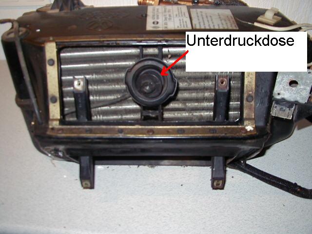 - An der oberen Klappe ist eine Unterdruckdose eingehängt (im ersten Bild das grüne Bauteil). Wird die Dose mit Unterdruck beaufschlagt, zieht sie die obere Klappe (Frischluftklappe) zu. Entsprechend öffnet sich die untere Klappe im Fußraum (Umluftklappe). Der Verdampferkasten saugt Innenluft an - es herrscht Umluftbetrieb. So sieht die Unterdruckdose hinter der Frischluftklappe aus: